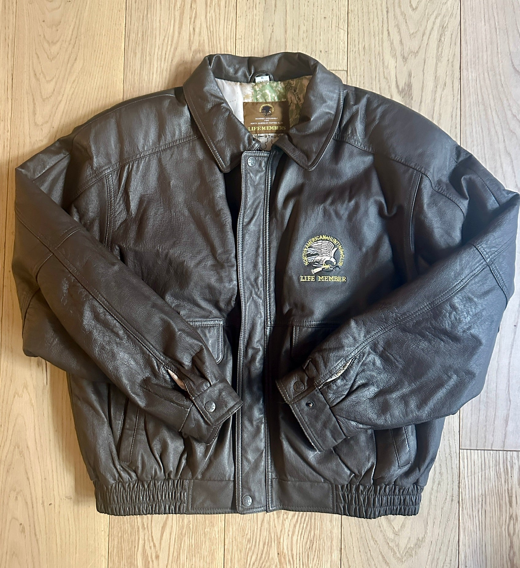 Vintage North American Hunting Club Life Member leather bomber jacket.